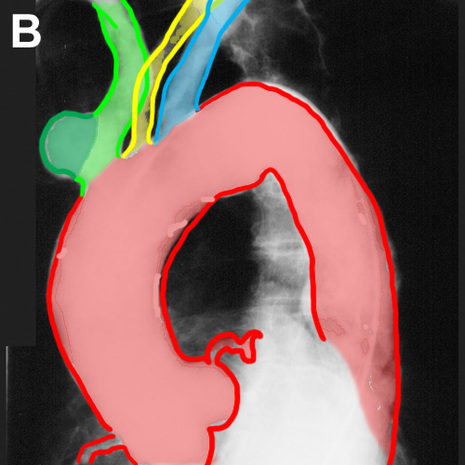 Image B shows the aortic arch and its branches outlined: