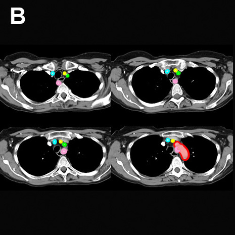 The aorta is outlined in red. The right subclavian artery has an anomalous origin, coming off as the last branch of the aortic arch and passing posterior to the trachea and esophagus. This is called an aberrant right subclavian artery. The aberrant vessel is shown in pink. The right common carotid artery (there is no brachiocephalic artery in this case, since the right common carotid artery and right subclavian artery do not arise from a common trunnk) is shown in blue, the left common carotid artery in yellow and the left subclavian artery in green.