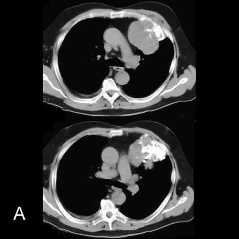 Image B shows the chondrosarcoma originating in an anterior left upper rib, outlined in red. The mass contains considerable calcification, with a somewhat swirling shape that is characteristic of lesions arising from cartilaginous cells, shown in blue.